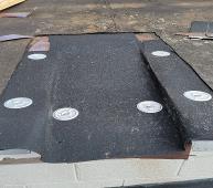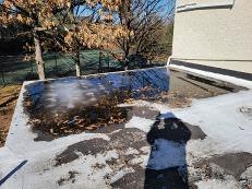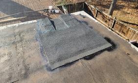 Flat Roof with ponding issues which causes leaks to form. We cut out a section of the roof to create a ramp that prevents water from ponding. Previous roof repairs had ironically resulted in the edge of the roof being raised with underlying flashing creating the damn effect. This new ramp quickly drains the water of the roof. |